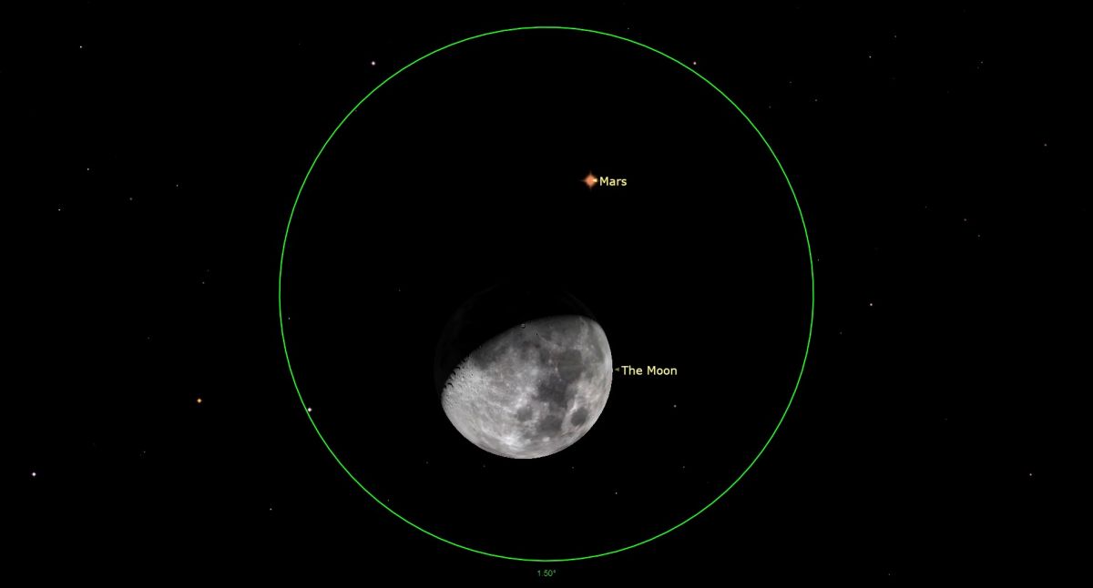 From New York City, the moon and Mars will be just one-tenth of a degree apart, according to In-the-sky.org (opens in new tab). The duo will be visible from 12:10 p.m. EST (1710 GMT) until 3:23 a.m. EST (0823 GMT), and they’ll be able to fit within the field of view of a telescope. You’ll also be able to see the pair with binoculars and the naked eye.