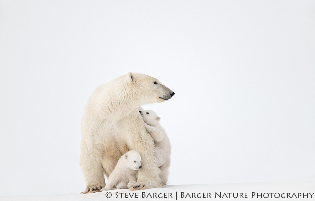 Two cubs-of-the-year protected by their mother; one climbing on its mothers back while the other watches in Wapusk National Park near Churchill, Manitoba, Canada